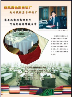 我廠是從織布到成品縫制一條龍的全能型臺布專業(yè)生產(chǎn)廠,具有生產(chǎn)各類臺布的多功能設備,有超寬幅(360cm-380cm)劍桿機,可生產(chǎn)各類超寬幅臺布和裝飾布,及各類服裝面料等,如色織床單布,沙發(fā)布,全棉寬幅布等,VISA(維莎)臺布;仿亞麻臺布;棉感臺布是我廠的推薦產(chǎn)品,格子臺布;高支高密緞紋臺布和大提花臺布是我廠的常備產(chǎn)品,歡迎來廠考察指導。 我廠專業(yè)生產(chǎn)臺布、臺裙、椅子套等酒店大堂紡織。我的電話是零伍壹零 捌柒捌陸壹捌叁肆