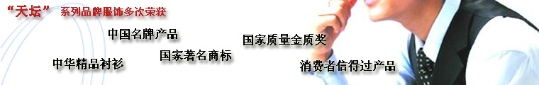 公司的“天壇”品牌商標(biāo)注冊(cè)于1955年,先后獲得“國(guó)家質(zhì)量金質(zhì)獎(jiǎng)”、“國(guó)家著名商標(biāo)”、“中國(guó)十大名牌服裝”、“中華精品襯衫”、“北京市名牌產(chǎn)品”、“北京市優(yōu)質(zhì)產(chǎn)品”、“北京市好產(chǎn)品”、“北京市拳頭產(chǎn)品”、“消費(fèi)者信得過產(chǎn)品”等百余項(xiàng)榮譽(yù),在全國(guó)性七次襯衫評(píng)比中,七次奪魁。2001年“天壇”品牌又榮獲中國(guó)名牌戰(zhàn)略推進(jìn)委員會(huì)授予的首批“中國(guó)名牌產(chǎn)品”稱號(hào)。許多國(guó)家領(lǐng)導(dǎo)人及知名人士在公司設(shè)計(jì)訂做服裝,影響巨大。